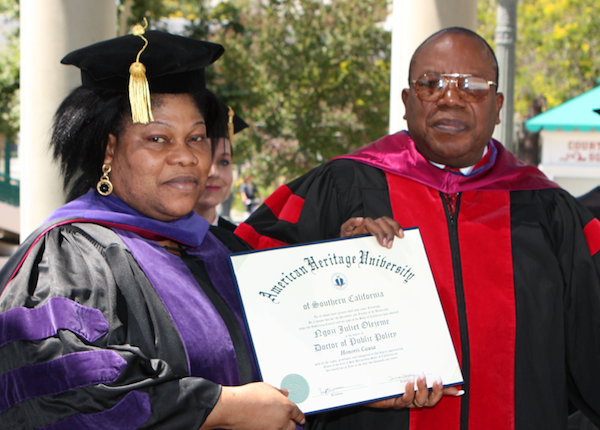 A prominent Nigerian politician and an advocate for women’s right, Mrs. Juliet Ngozi Olejeme was recently honoured with a Doctorate Degree Award at the just concluded convocation ceremony of American Heritage University of Southern California (AHUSC).